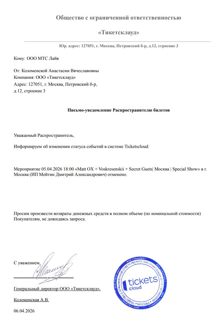 Уважаемый клиент! Спешим сообщить, что по информации, полученной от организатора, rонцерт «Matt OX + Voskresenskii + Secret Guets. Special Show», запланированный на 5 апреля 2026 года в 18:00 в Base, отменён. Деньги за электронные билеты вернутся автоматически в полном объёме на карту, с которой была произведена оплата. Если вы купили билет в кассе Ticketland.ru за наличный расчет или оплатили подарочной картой, то обратитесь, пожалуйста, на почту: vozvrat@ticketland.ru. С уважением, команда поддержки Ticketland.