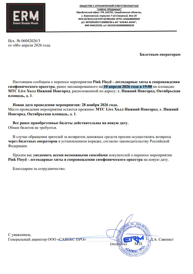 Уважаемый клиент! Спешим сообщить, что по информации, полученной от организатора, концерт «Pink Floyd — легендарные хиты в сопровождении симфонического оркестра», запланированный на 10 апреля 2026 года в 19:00 в МТС Live Холл Нижний Новгород, перенесен на 28 ноября 2026 года в 19:00. Ранее приобретенные билеты действительны на новое время, обменивать их не нужно. Если вам не удобно посетить мероприятие в новое время, вы можете вернуть билет по кнопке в личном кабинете во вкладке «Заказы». Деньги за электронные билеты вернутся автоматически в полном объёме на карту, с которой была произведена оплата. Если вы купили билет в кассе Ticketland.ru за наличный расчет, то обратитесь, пожалуйста, на почту: vozvrat@ticketland.ru. С уважением, команда поддержки Ticketland