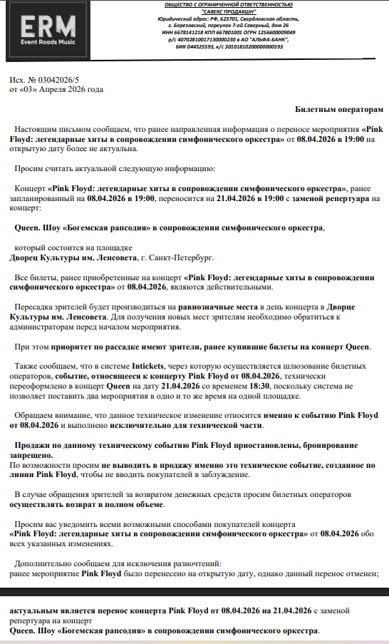 Уважаемый клиент! Спешим сообщить, что по информации, полученной от организатора, концерт «Pink Floyd» - легендарные хиты в сопровождении симфонического оркестра», запланированный на 8 апреля 2026 года в 19:00 в ДК «Ленсовета», перенесён на 21 апреля 2026 года с заменой репертуара на концерт: Queen. Шоу «Богемская рапсодия» в сопровождении симфонического оркестра. Ранее приобретенные билеты действительны на новую дату, обменивать их не нужно. Если вам не удобно посетить концерт в новую дату, вы можете вернуть билет по кнопке в личном кабинете во вкладке «Заказы». Деньги за электронные билеты вернутся автоматически в полном объёме на карту, с которой была произведена оплата. Если вы купили билет в кассе Ticketland.ru за наличный расчет или оплатили подарочной картой, то обратитесь, пожалуйста, на почту: vozvrat@ticketland.ru. С уважением, команда поддержки Ticketland.